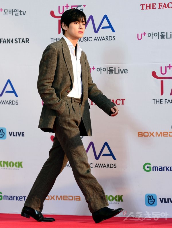 24일 인천 남동체육관에서 열린 ‘더팩트 뮤직 어워드(THE FACT MUSIC AWARDS)’에 참석한 방탄소년단 뷔가 레드카펫을 밟으며 입장하고 있다.