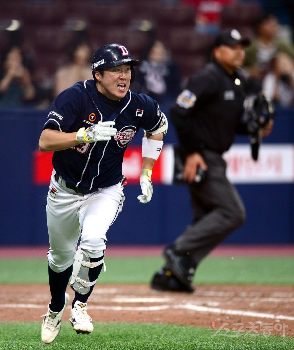 6회초 무사 두산 허경민이 중전 2루타를 치고 있다.