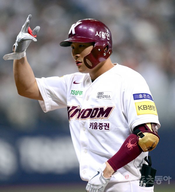 5회말 1사 3루 키움 김하성이 1타점 적시타를 치고 1루에서 기뻐하고 있다.