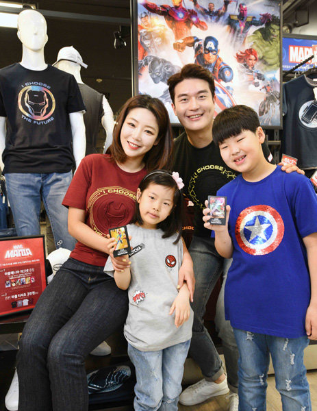 24일 홈플러스 강서점에서 모델들이 마블 티셔츠와 한정판 마그넷(자석액자)을 선보이고 있다. 홈플러스 패션 자체브랜드(PB) F2F는 어벤져스 영웅들이 등장하는 마블 캐릭터 티셔츠 36종을 내놓았다. 30일까지 3000원 할인 이벤트와 함께 마블 티셔츠 2개 이상 구매 고객에게 선착순으로 마블마니아 한정판 마그넷을 증정한다.
