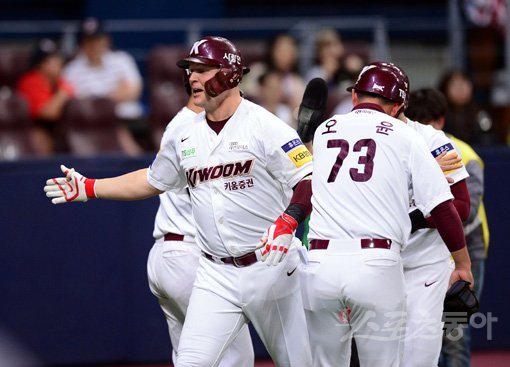24일 서울 고척스카이돔에서 ‘2019 신한은행 MY CAR KBO리그’ 두산 베어스와 키움 히어로즈의 경기가 열렸다. 7회말 1사 만루 키움 샌즈가 만루 홈런을 날리고 그라운드를 돌아 홈인해 하이파이브하고 있다. 고척|김종원 기자 won@donga.com