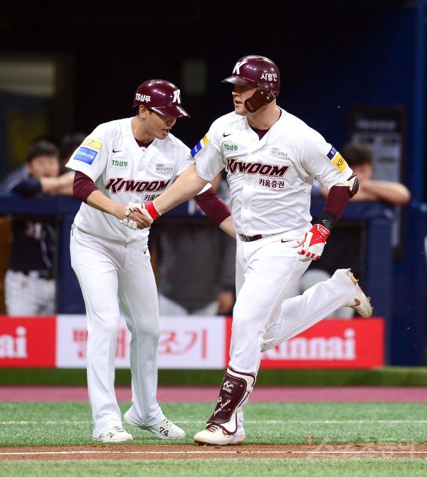 7회말 1사 만루 키움 샌즈가 만루 홈런을 날리고 그라운드를 돌며 하이파이브하고 있다.