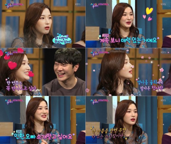 율희는 “당시 나는 19살이었다. 오빠는 나를 몰랐다”면서 “계속 보니까 매력 있더라. 저 사람과 한 번쯤은 만나보고 싶었다. 지나가면서 계속 눈길이 가더라. 드럼 치는 모습이 멋있었다”고 고백했다.