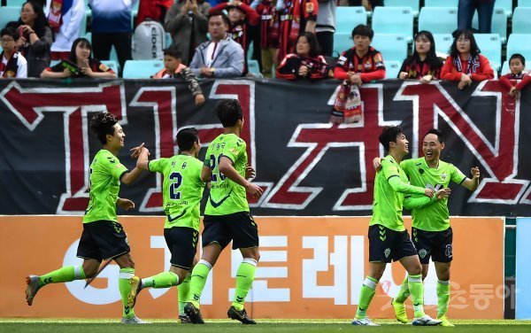 28일 전주월드컵경기장에서 ‘하나원큐 K리그1 2019’ 전북현대와 FC서울의 경기가 열렸다. 전북현대 이승기(오른쪽 두 번째)가 전반 선취골을 넣은 후 동료들과 기쁨을 나누고 있다.
