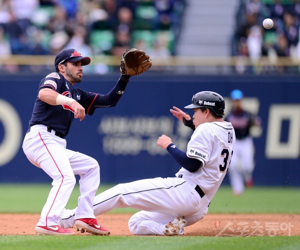 1회말 2사 1루 상황에서 두산 오재일이 2루 도루에 성공하고 있다.