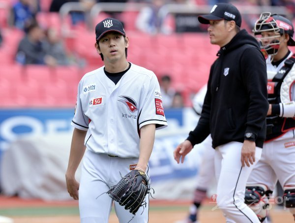 8회초 무사 1, 2루에서 kt 선발 이대은이 교체되며 아쉬워하고 있다.