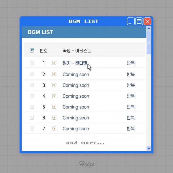 미니홈피 BGM 목록 콘셉트로 꾸며진 티징 이미지 속에는 리스트 1번 트랙으로 캔디맨의 ‘일기’가 기재됐으며, 이후에도 꾸준한 리메이크 콘텐츠가 예고돼있어 팬들의 기대감을 높이고 있다.