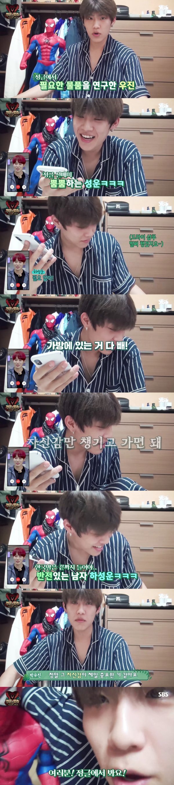 이어 우진은 정글 선배, 워너원 하성운에게 더 필요한 물건이 있는지 도움을 요청했다. 전화 속 성운은 다짜고짜 “가방에 있는 거 다 빼!”라고 말해 우진을 당황시켰다. 긴장한 우진에게 성운은 다 필요없고 “자신감만 챙기고 가면 돼”라며 깨알 같은 반전을 선사한 것.