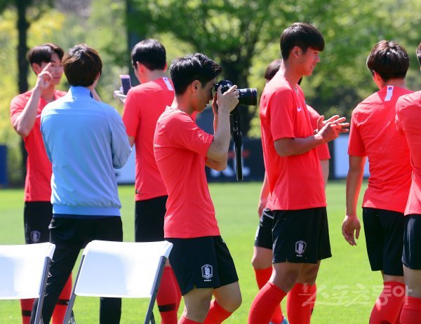이강인이 카메라를 들고 사진을 찍고 있다.