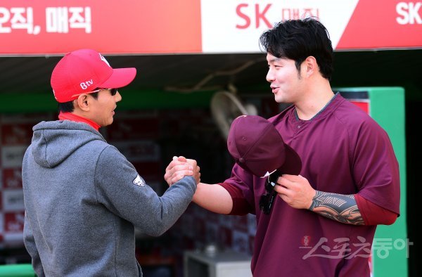 경기 전 키움 박병호와 SK 염경엽 감독이 악수를 나누고 있다.
