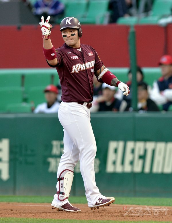1회초 1사 1, 3루에서 키움 박병호가 1타점 적시타를 날린 뒤 세리머니를 펼치고 있다.
