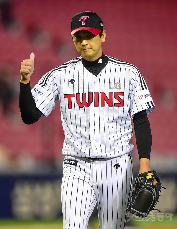 LG 두 번째 투수 심수창이 등판해 이닝을 마친 후 엄지손가락을 내밀고 있다.