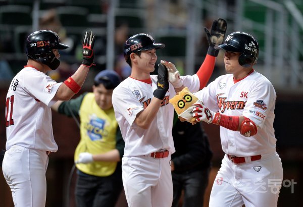 4회말 1사 만루에서 SK 최정이 좌월 만루 홈런을 쏘아 올린 뒤 동료들의 환영을 받고 있다.
