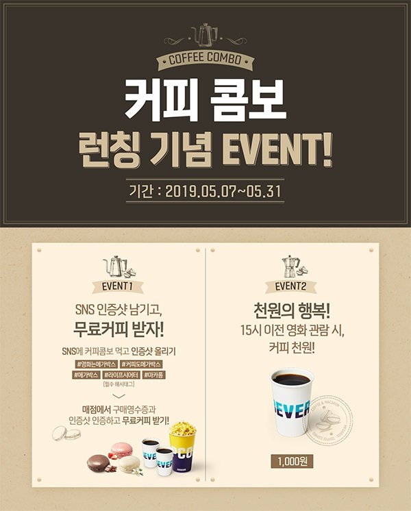 한편, 메가박스는 이번 ‘커피 콤보’ 출시를 기념해 7일부터 31일까지 두 가지 이벤트를 진행한다. 먼저, 개인 SNS에 #영화는메가박스, #커피도메가박스 등의 필수 해시태그와 함께 ‘커피 콤보’ 인증샷을 올린 다음 매점에서 구매영수증과 인증샷을 보여주면 커피가 무료로 제공된다. 더불어 ‘천원의 행복’ 이벤트를 통해 이벤트 기간 동안 오후 3시 이전 영화 관람 시 ‘천원’이라는 파격적인 가격에 커피를 구매할 수 있다.