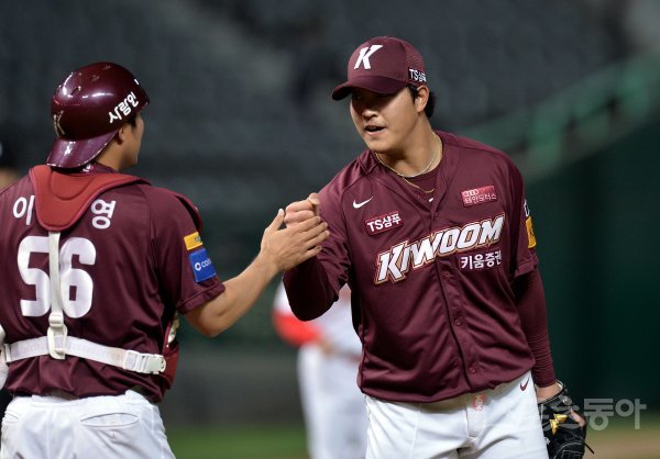 키움이 SK에 10-8로 승리한 뒤 세이브를 올린 조상우가 이지영과 하이파이브를 나누고 있다.