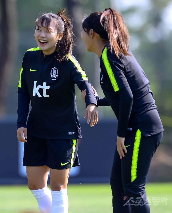 여자축구대표팀 장슬기가 스트레칭을 하는 중 동료와 환하게 웃고 있다.