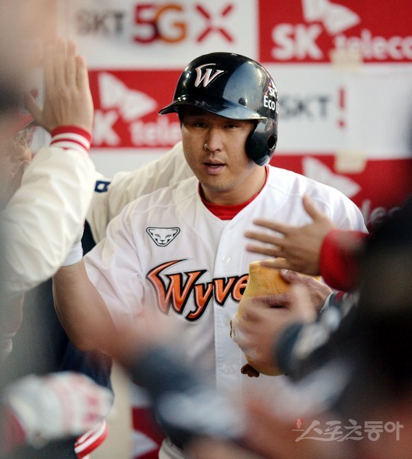 3회말 무사 2루에서 SK 최정이 좌월 투런 홈런을 쏘아 올린 뒤 동료들의 환영을 받고 있다.