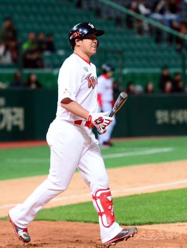 8회말 무사에서 SK 최정이 타격을 펼쳤으나 한화 김회성의 호수비에 아웃되자 아쉬워하고 있다.