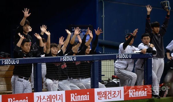 1회초 LG 덕아웃 선수들이 이형종의 안타가 터지자 1루를 바라보며 안녕 세리머니를 하고 있다.
