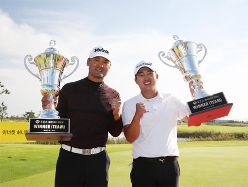 지난해 우승자인 박찬호와 김영웅(오른쪽)이 트로피를 들고 포즈를 취하고 있다. 사진제공|KPGA