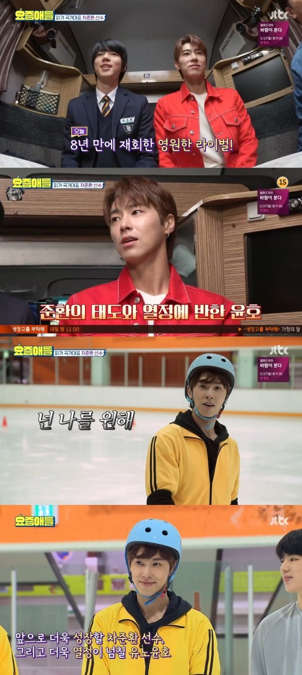 유노윤호는 12일 밤 방송된 JTBC 예능 프로그램 ‘요즘 애들’의 최종회에서 피겨 스케이팅 국가대표 선수 차준환의 깜짝 손님으로 출연해 눈길을 끌었다.