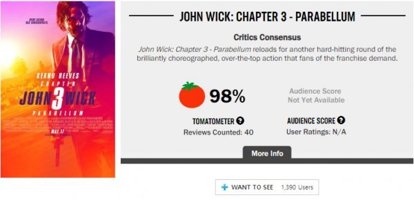 한편, 더 강렬해진 액션은 물론 더욱 넓어진 세계관과 역대급 스케일로 북미에선 일찌감치 ‘마블의 유일한 대항마’로 불려온 <존 윅 3: 파라벨룸>이 로튼토마토 신선도지수 98%를 기록, 6월 극장가 흥행 기대작으로 완벽히 자리매김했다. 해외 언론과 평론가들의 반응은 폭발적이다. 약 40여개의 리뷰 대부분 극찬을 쏟아냈다. 해외 언론들은 “확장된 액션 시퀀스, 압도적인 출연진, 더욱 더 많아진 개들로 거대한 스케일을 선보인다!” (Terri Schwartz [IGN Movies]), “미친 액션 영화!” (Sean Mulvihill [FanboyNation.com]), “<존 윅 3: 파라벨룸>은 프랜차이즈의 기준을 높이고 세계관에 새로운 깊이를 더했다!” (Brent Goldman [Film Inquiry]), “창의적이면서 잔혹한 액션 시퀀스들로 가득하다” (Jim Vejvoda [IGN Movies]) 등의 평을 남기며 시리즈의 대미를 장식하는 작품의 스케일, 완성도, 독창적인 액션 등에 칭찬을 아끼지 않았다. 전편인 ‘존 윅’, ‘존 윅 – 리로드’가 액션 영화로는 이례적으로 각각 87%, 89%의 높은 로튼토마토 신선도를 획득한 것에 더해 한층 높아진 <존 윅 3: 파라벨룸>의 신선도지수는 영화팬들의 기대감을 더욱 증폭시킨다. 뿐만 아니라, ’존 윅 3: 파라벨룸’은 로튼토마토가 선정한 2019년 최고 기대작 65편 중 한 편으로 당당히 이름을 올려 전 세계적인 뜨거운 관심을 입증했다.
