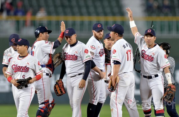 롯데가 LG에 4-0으로 승리한 뒤 선수들이 그라운드에서 기쁨을 나누고 있다.