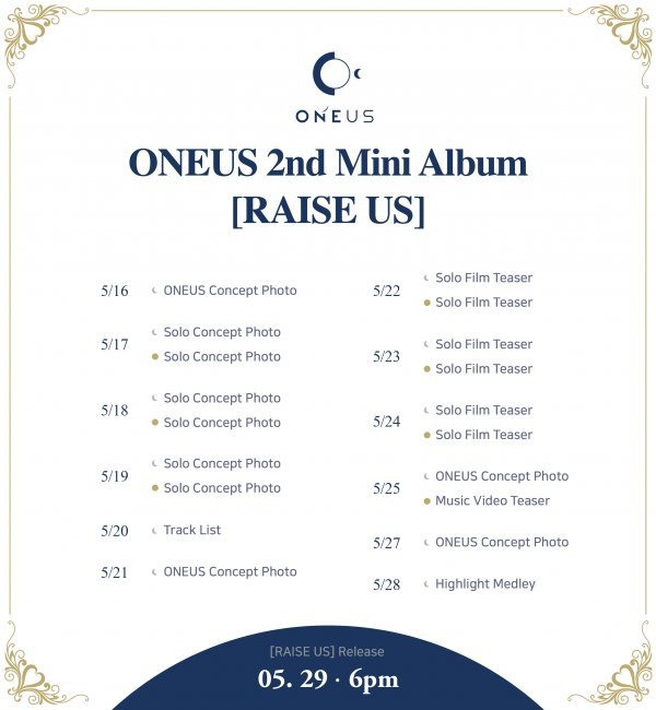 고급스러운 분위기가 감도는 사진 속에는 이번 앨범의 타이틀인 \'RAISE US\'와 발매일자가 적혀있어 눈길을 끈다. 하단에는 16일 단체 콘셉트 포토를 시작으로 솔로 콘셉트 포토, 트랙리스트, 솔로 필름 티저, 뮤직비디오 티저, 하이라이트 메들리 등 다양한 콘텐츠 오픈 일정이 공개돼 궁금증을 높인다.