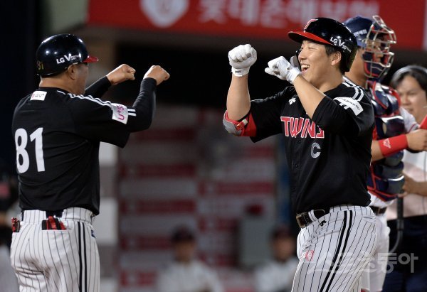 4회초 1사 1루에서 LG 김현수가 우월 투런 홈런을 쏘아 올린 뒤 김호 코치의 환영을 받고 있다.
