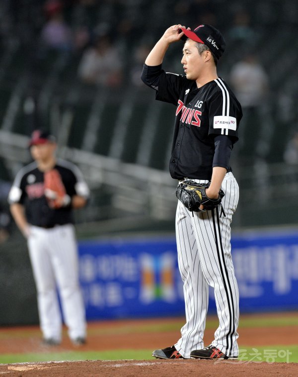 8회말 2사 2, 3루에서 롯데 전준우에게 2타점 역전타를 허용한 LG 신정락이 아쉬워하고 있다.