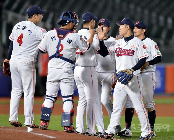 롯데가 LG에 8-4로 역전승을 거둔 뒤 선수들이 그라운드에서 기쁨을 나누고 있다.