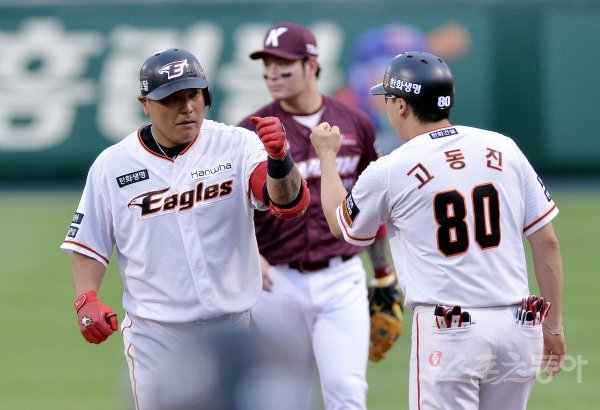 1회말 2사 3루에서 한화 김태균이 1타점 적시타를 날린 뒤 고동진 코치의 환영을 받고 있다.