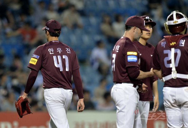 3회말 1사 만루에서 한화 지성준에게 2타점 2루타를 허용한 키움 선발 안우진이 교체되고 있다.