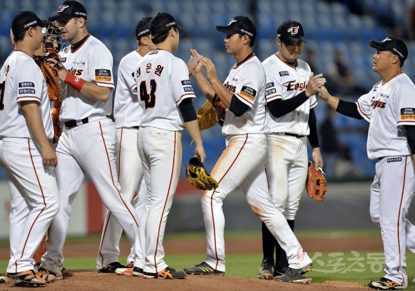 한화가 키움에 15-6으로 승리한 뒤 선수들이 그라운드에서 기쁨을 나누고 있다.
