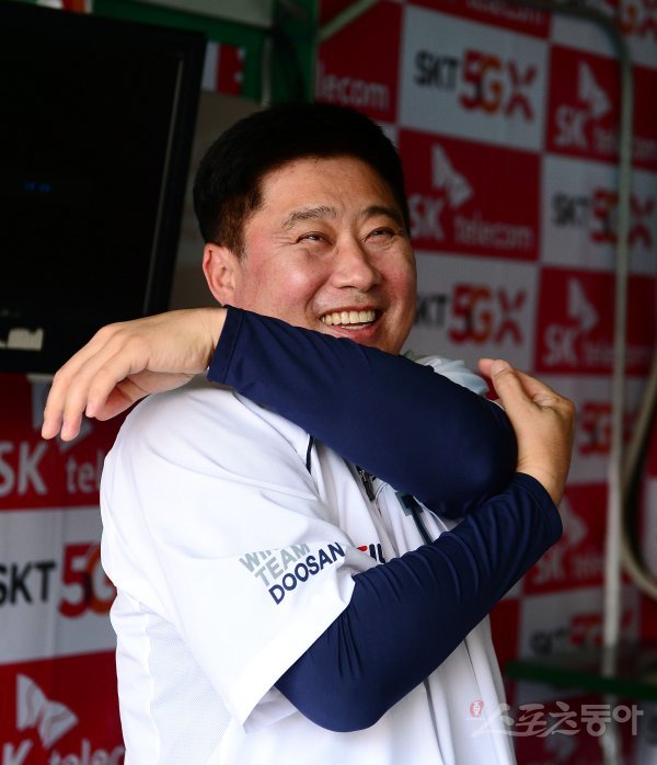 경기 전 두산 김태형 감독이 취재진과 인터뷰를 하고 있다.