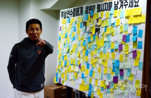 경기 전 SK 염경엽 감독이 부상 선수들의 응원 메시지가 담긴 메모판을 바라보고 있다.