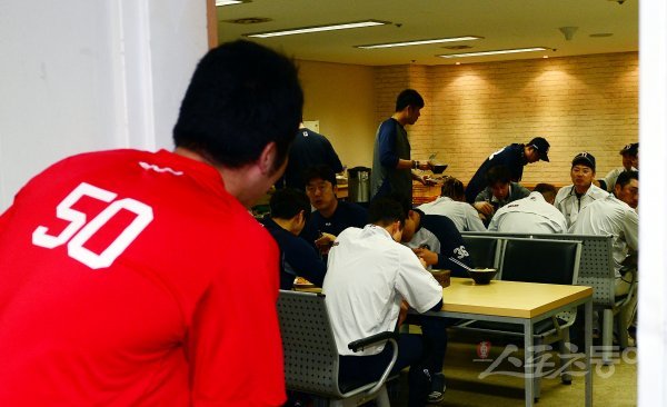 경기 전 전날 김재환에게 헤드샷을 던진 SK 박종훈이 두산 라커룸을 찾아 사과의 인사를 하고 있다.
