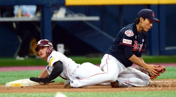 4회말 1사 2루 롯데 와일드피칭 때 2루주자 키움 김하성이 3루로 달려 세이프되고 있다.