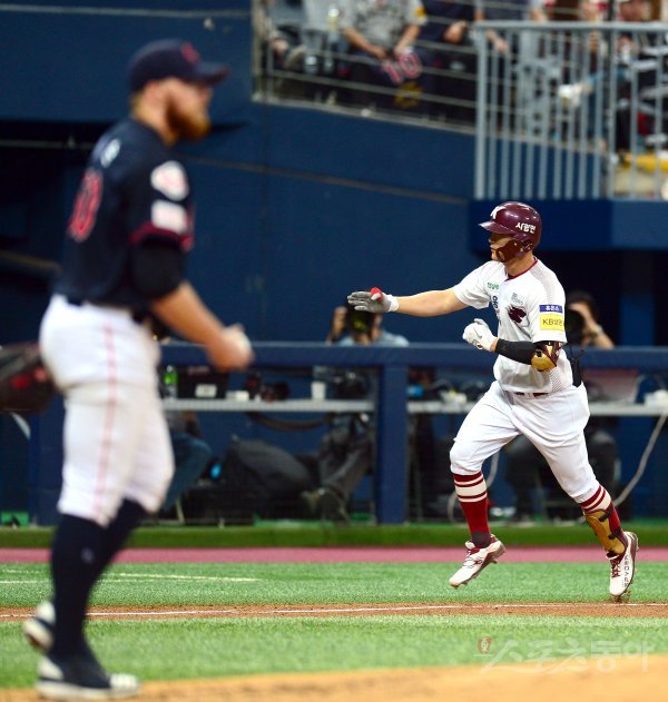 2회말 1사 1,3루 키움 김하성이 좌월 스리런 홈런을 날리고 그라운드를 돌며 하이파이브하고 있다.