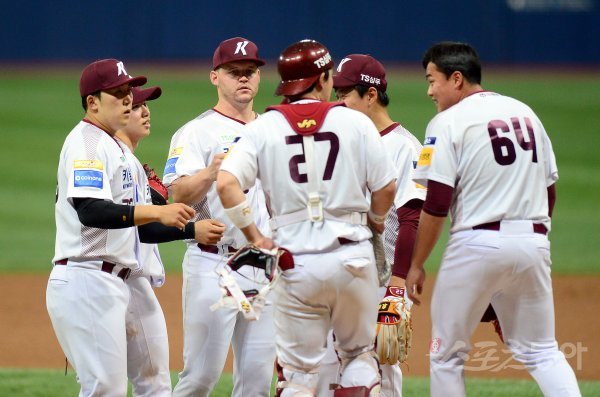 9-3 승리를 거둔 키움 선수들이 하이파이브하고 있다.