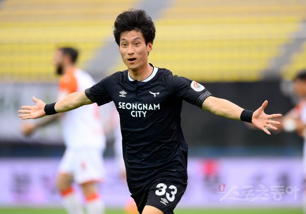 전반 성남FC 최병찬이 선취골을 넣은 후 환호하고 있다.
