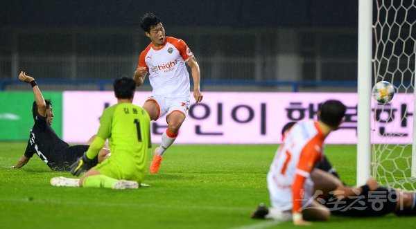 후반 강원FC 김지현(오른쪽)이 추가시간에 역전골을 넣고 있다.