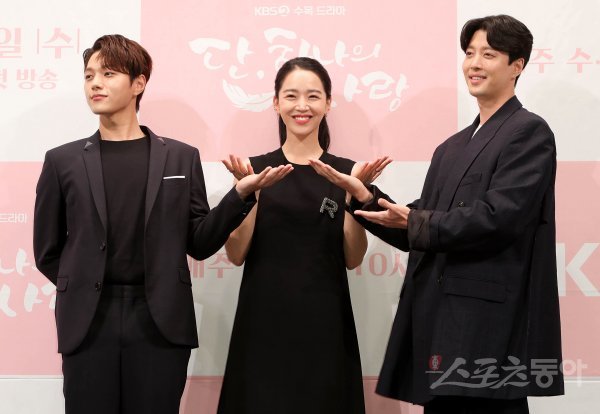 배우 김명수와 신혜선, 이동건(왼쪽부터)이 21일 서울시 강남구 임피리얼 팰리스 서울에서 열린 KBS 2TV 새 수목드라마 ‘단, 하나의 사랑’ 제작발표회에 참석해 포즈를 취하고 있다.