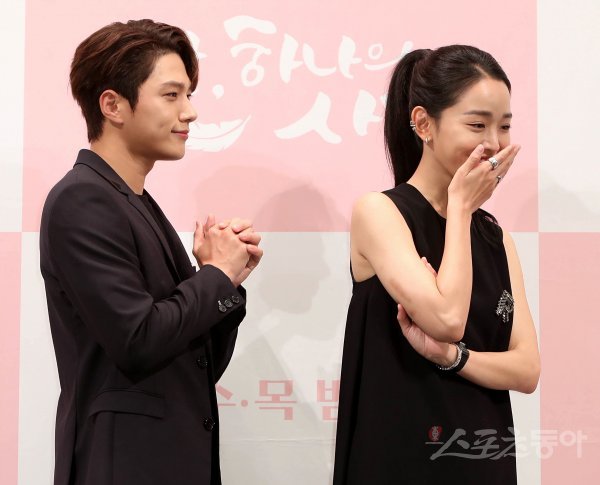 배우 김명수와 신혜선(오른쪽)이 21일 서울시 강남구 임피리얼 팰리스 서울에서 열린 KBS 2TV 새 수목드라마 ‘단, 하나의 사랑’ 제작발표회에 참석해 포즈를 취하고 있다.