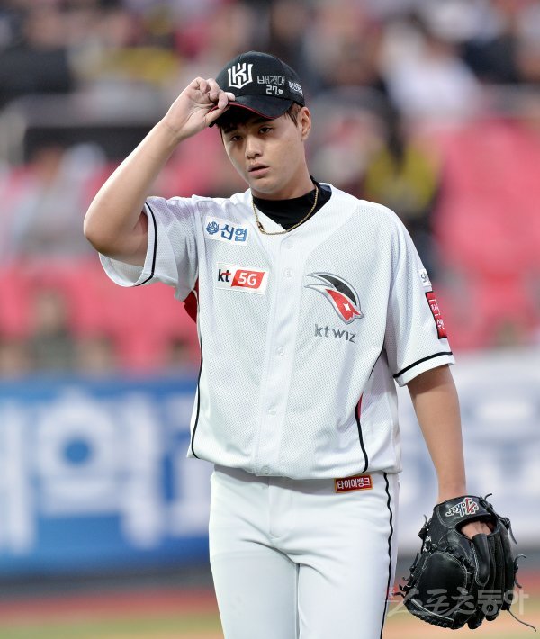 2회까지 3실점을 허용한 kt 선발 김민이 이닝 종료 후 더그아웃으로 들어서고 있다.