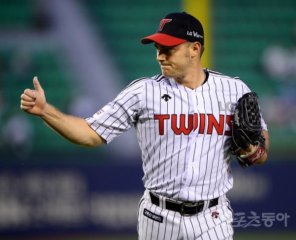 LG 선발 윌슨이 6회초 이닝을 무실점으로 막은 후 포수를 향해 엄지를 들어보이고 있다.