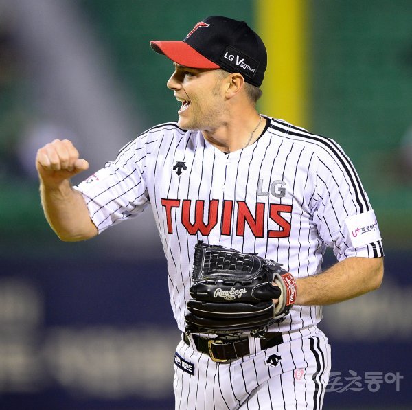 LG 선발 윌슨이 7회초 이닝을 무실점으로 막은 후 환호하며 덕아웃으로 향하고 있다.