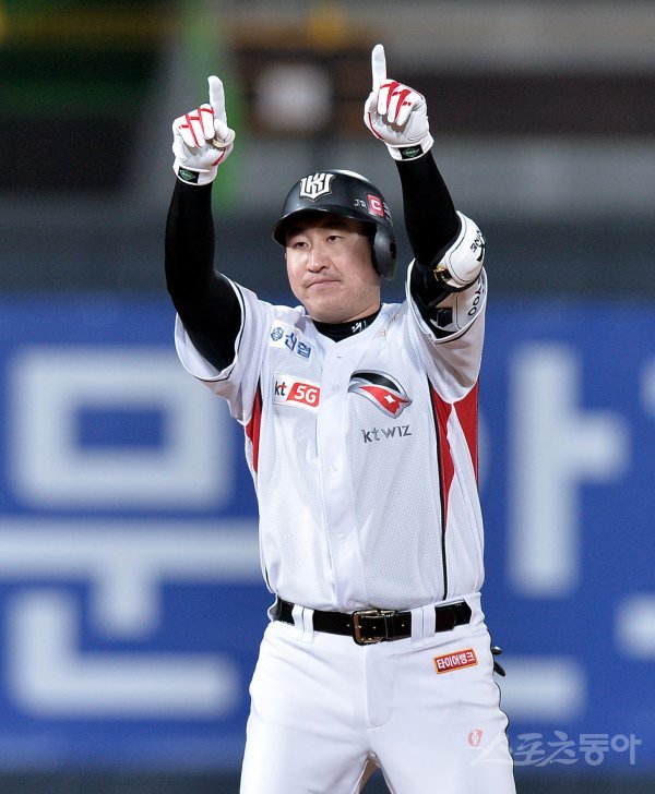 6회말 2사 1루에서 kt 유한준이 1타점 2루타를 날린 뒤 환호하고 있다.