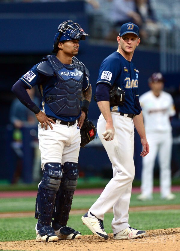 6회말 비디오 판독 때 NC 포수 베탄코트가 마운드에 올라 루친스키와 이야기하고 있다.