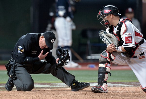 8회초 2사 1, 2루에서 두산 오재원의 헛스윙 때 볼을 맞은 김병주 주심이 고통을 호소하고 있다.